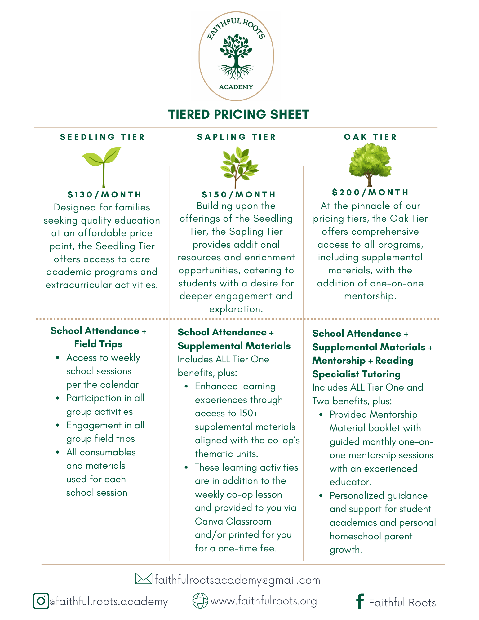 Tuition: Due the FIRST of the month via check, cash, or Venmo.Listed prices are for the full month, per child (10% discount for each additional sibling). If you are enrolling a second child, they are automatically enrolled at the Seedling Tier price. Choosing the Sapling or Oak Tier covers your entire household in regards to all the tier benefits.